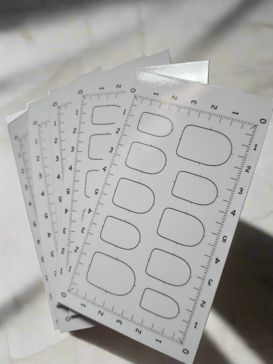 Aceste planșe îți oferă viziunea completă a unei manichiuri , pe care poți concepe și picta dinainte modele pentru clienții tăi. Le poți folosi și ca riglă, pentru a măsura unghiile clienților, fie când trebuie să măsori proporțiile unui french , fie când vrei să îi pictezi ceva dinainte, și trebuie să îi știi dimensiunile. Le poți perfora și adăuga într-o agendă destinată modelelor pre-pictate, pe care clienții tăi să o răsfoiască atunci când nu au inspirație.